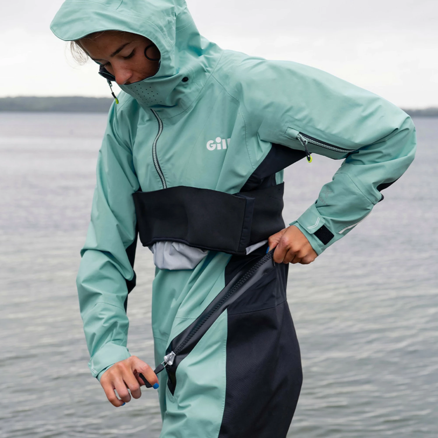 Featuring a grown on hood with 2 way adjustment and shockcord retaining loop for stowing away when not in use. Offset YKK AquaGuard zip, soft fleece inner chin guard and laser-cut ventilation holes for comfort. Inner neoprene dryseal gaskets at neck and cuffs acts as a barrier against external elements. Featuring reinforced backseat and knees for extra durability.